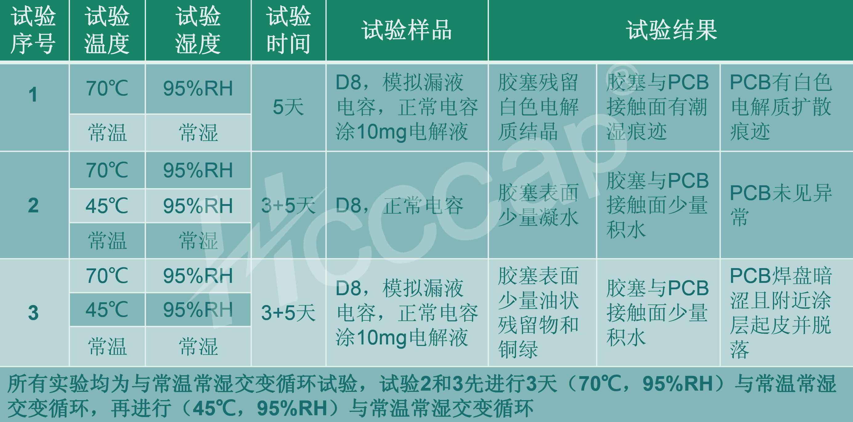 2.无论正常超级电容,还是模拟”漏液“电容,持续高温高湿(70℃, 95%RH)与常温常湿交变循环短时不会导致电容本身特性或者关联 PCB出现异常;
